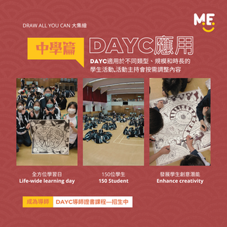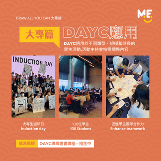 作為一家策劃團體活動的公司,經常需要去發掘新類型的活動,自從引入Draw All You Can大集繪後十分受客戶歡迎。到後期發現社工、教師、活動導師們經常要自己舉辦大大小小的小組活動及課堂活動,對於自己帶活動有很大需求,於是我們決定以「帶領活動」為前提,配合Draw All You Can大集繪的特性不定期開辨導師證書課程,以解決社工、教師在帶活動上的困難。歡迎機構查詢包班。